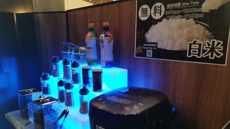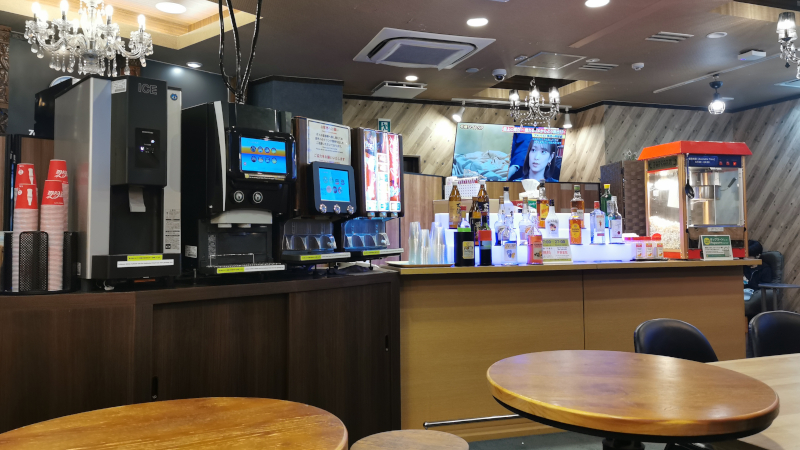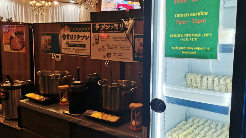在二楼的共同空间里,旅店提供饮料、酒(最多5杯)、拉面(最多1碗)、爆米花,还有米饭和拌饭料,全部都是免费的。